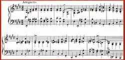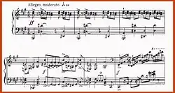 La sonata se abre de manera casi « aterradora » [Be 3] por las tres notas del tema martilladas sin descanso por la mano derecha en fortissimo, mientras la mano izquierda lucha y aniquila la tonalidad del La mayor del tema por el intervalo más disonante de la música, el Diabolus In Musica, el tritono.[Ja 2]