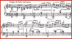 El tercer movimiento de la sonata es un vals lento en do mayor, cuya escritura exuberante y orquestal recuerda una vez más los valses contemporáneos del ballet de la Cenicienta.[Be 8] El clima del movimiento es muy cálido y romántico, pero desde el primer compás y durante todo el movimiento, encontramos las 3 notas descendentes del tema leitmotiv de la sonata, que introducen inquietantes reminiscencias [Be 8] . La estructura general del movimiento se divide en tres secciones en el esquema clásico A.B.A.