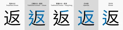 Source Han Sans tiene cinco versiones de idiomas: chino simplificado, chino tradicional de Taiwán, chino tradicional de Hong Kong, japonés y coreano.[9] Debido a las diferentes convenciones y estándares para cada una de las regiones donde se usan los idiomas, el mismo carácter en Unicode puede tener una forma diferente para cada una de las versiones de idiomas.
