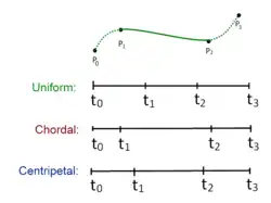 en el que va de 0 a 1 para la parametrización de los nodos, y con . Para el spline centrípeto de Catmull-Rom, el valor de es . Cuando , la curva resultante es el spline uniforme de Catmull-Rom estándar; y cuando , el resultado es el spline cordal de Catmull-Rom.