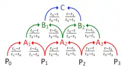 A3= (t3 - t) / (t3 - t2) * P2 + (t - t2) / (t3 - t2) * P3