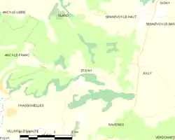 - Situación de Stigny en un mapa de Francia y de comunas limítrofes (enlace roto disponible en Internet Archive; véase el historial, la primera versión y la última). (en francés)
