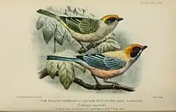 - ↑ a b c Ridgely, Robert; Tudor, Guy (2009). Field guide to the songbirds of South America: the passerines. Mildred Wyatt-World series in ornithology (en inglés) (1a. edición). Austin: University of Texas Press. ISBN 978-0-292-71748-0. «Tangara cayana, p. 591, lámina 93(7A y 7B)».