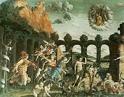 - Combate del Amor y la Castidad, de Perugino] cuyo programa iconográfico fue propuesto por Paride da Ceresara que era un humanista y astrólogo de la corte. El cuadro fue pintado en Florencia y enviado terminado a Mantua en 1505.[1]