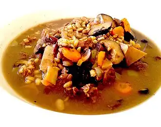La sopa a menudo incluye cebollas y papas y simplemente se sazona con sal, pimienta negra y hojas de laurel.[1] A menudo se espesa con arroz[3] o empapando cebada en agua durante la noche para que el almidón se filtren en el agua.