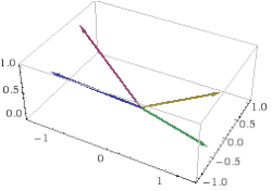 Gráfica de dos vectores y sus respectivas transformaciones mediante una rotación respecto al eje z. El vector contenido en el plano xy (amarillo) tiene una transformada (verde) en el mismo plano