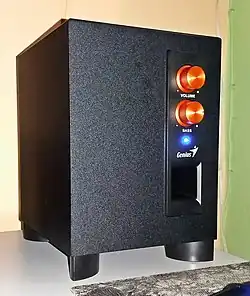 - ↑ Si bien existen diseños pasivos bajo la denominación subwoofer, estos se refieren, típicamente, a altavoces (en realidad, poco más que una caja con un transductor electroacústico y un filtro pasa bajo pasivo) de muy baja calidad con respuestas en frecuencia pobres que casi nunca cubren la primera octava y suben hasta frecuencias impropias de un componente de este tipo.