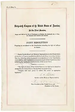 La Decimonovena Enmienda a la Constitución de los Estados Unidos estipula que ni los estados de los Estados Unidos ni el gobierno federal pueden denegarle a un ciudadano el derecho de voto a causa de su sexo. Fue presentada inicialmente en el Congreso en 1878 y hubo varios intentos de aprobar una enmienda al sufragio femenino que fracasaron hasta que se aprobó en la Cámara de Representantes el 21 de mayo de 1919 y luego por el Senado el 4 de junio de 1919. Luego se presentó a los Estados para su ratificación. El 18 de agosto de 1920, Tennessee fue el último de los 36 estados necesarios para asegurar la ratificación. La Decimonovena Enmienda fue adoptada oficialmente el 26 de agosto de 1920 y fue la culminación de un movimiento de décadas por el sufragio femenino tanto a nivel estatal como nacional.[2]