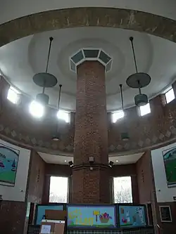 La rotonda es una estructura cilíndrica de ladrillo. Vista desde su fachada este, se encuentra detrás de dos pilares hechos de ladrillos aglomerados flamencos, cada uno de los cuales tiene un asta de bandera y un panel de azulejos. Las palabras sunset play center están inscritos en una tableta de granito sobre la entrada principal (este), que consta de un conjunto de puertas de metal. La entrada oeste, frente a la piscina, es casi idéntica pero no tiene astas de bandera, y un gran logotipo de NYC Parks colgando sobre las puertas de metal.[11] Losmuros interiores están hechos en su mayor parte de ladrillo aglomerado flamenco con una base de granito. El vestíbulo está dentro de la rotonda y se compone de tres áreas: la que conduce al este a la entrada, el cilindro central y la que conduce al oeste a la piscina. Los vestíbulos tienen un piso de altura, mientras que el cilindro central tiene un piso y medio. El muro exterior curvo está rematado por un dintel de hormigón. Lámparas cuelgan del techo de yeso blanco. En el nivel del triforio, cerca de la parte superior del vestíbulo, hay 16 ventanitas. El suelo es de baldosas de color azul oscuro y terracota y tiene varios desagües.[12]