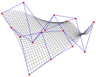 Las superficies de Bézier son un tipo de splines utilizados en el modelado mediante computación gráfica, en el diseño asistido por computadora y en el método de los elementos finitos. Al igual que las curvas de Bézier, una superficie de Bézier está definida por un conjunto de puntos de control. Similar a la interpolación en muchos aspectos, una diferencia clave es que la superficie, en general, no pasa por los puntos de control centrales; y más bien, se "estira" hacia ellos como si cada uno fuera una fuerza atractiva. Son visualmente intuitivos y, para muchas aplicaciones, matemáticamente convenientes.[1]