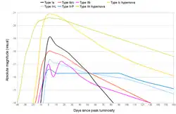 A diferencia de los espectros, las curvas de luz son bastante diferentes de los tipos comunes de supernova. Las curvas de luz están muy extendidas y el pico de luminosidad se produce meses después del inicio.[8] Esto se debe a las cantidades extremas de 56Ni expulsadas y a la eyección ópticamente densa, ya que la estrella está completamente perturbada.
