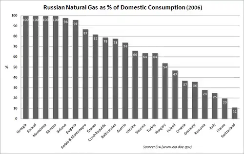 Rusia ha sido acusada por Occidente de usar sus recursos naturales como un instrumento político contra Georgia, Ucrania, y otros países por los que se siente "amenazada". [cita requerida] A principios de 2006, Rusia aumentó drásticamente el precio del gas para Ucrania, tras la "Revolución Naranja" de este país. [cita requerida] Más tarde se duplicaron los precios del gas natural para Georgia, a raíz de un incidente internacional. Los críticos especularon que esto fue un intento de socavar el desafío a Moscú por parte de los líderes georgianos. [cita requerida]