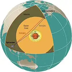 Las principales limitaciones de observación en la rotación del núcleo interno provienen de la sismología. Cuando ocurre un terremoto, dos tipos de ondas sísmicas viajan a través de la Tierra: aquellas con movimiento de tierra en la dirección en que se propaga la onda (ondas p) y aquellas con movimiento transversal (ondas s). Las ondas S no viajan a través del núcleo externo porque implican un esfuerzo cortante, un tipo de deformación que no puede ocurrir en un líquido. En notación sísmica, una onda p está representada por la letra P cuando viaja a través de la corteza y el manto y por la letra K cuando viaja a través del núcleo externo. PKP representa una ola que viaja a través del manto, núcleo y manto nuevamente antes de llegar a la superficie. Por razones geométricas, se distinguen dos ramas de PKP: PKP (AB) a través de la parte superior del núcleo externo y PKP (BC) a través de la parte inferior. Una onda que pasa a través del núcleo interno se conoce como PKP (DF). (Los nombres alternativos para estas fases son PKP1, PKP2 y PKIKP)[11] Las ondas sísmicas pueden recorrer múltiples caminos desde un terremoto hasta un sensor dado.[12]