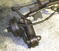 Consiste en un eje rígido sobre cuyos extremos pivotan las articulaciones de la dirección y de la suspensión. Las ruedas estaban montadas sobre pivotes verticales. El sistema incluía muelles helicoidales y amortiguadores dispuestos en el interior de un compartimento sellado, diseñado para permitir la lubricación y proteger el mecanismo de suspensión. Esta característica suponía una debilidad del diseño, puesto que cualquier fuga de aceite tenía efectos negativos sobre la durabilidad del sistema mecánico y sobre las condiciones de guiado del vehículo.