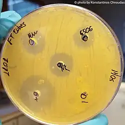 Se ha descubierto que los metabolitos producidos por las algas marinas tienen muchas propiedades antimicrobianas. Esto se debe a que son producidos por organismos marinos como disuasores químicos y, como tales, contienen compuestos bioactivos. Las principales clases de algas marinas que producen este tipo de metabolitos secundarios son Cyanophyceae, Chlorophyceae y Rhodophyceae. Los productos biogénicos observados incluyen policétidos, amidas, alcaloides, ácidos grasos, indoles y lipopéptidos.[1] Por ejemplo, más del 10% de los compuestos aislados de Lyngbya majuscula, que es una de las cianobacterias más abundantes, tienen propiedades antifúngicas y antimicrobianas.[1][6] Además, un estudio probó furanonas halogenadas producidas por Delisea pulchra de la clase Rhodophyceae contra el crecimiento de Bacillus subtilis.[15][1] Cuando se aplica a una concentración de 40 µg/mL, la furanona inhibió la formación de una biopelícula por las bacterias y redujo el grosor de la biopelícula en un 25% y el número de células vivas en un 63%.[15]