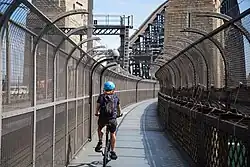 Una vez que se completó el arco, las grúas trepadoras se usaron para construir la calzada y otras partes del puente desde el centro hacia afuera. Al arco se le unieron los montantes verticales, que luego se unieron con los travesaños horizontales. La plataforma para la carretera y el ferrocarril se construyó sobre las vigas transversales, y se completó en junio de 1931, tras lo que se desmantelaron las grúas trepadoras. Se colocaron raíles para trenes y tranvías y se pavimentó la carretera con hormigón rematado con asfalto.[41] También se agregaron al puente en 1931 líneas eléctricas y telefónicas, tuberías de agua y gas, y el sistema de drenaje.