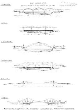 En 1900, el gabinete del gobernador William Lyne se comprometió a construir una nueva Estación Central en Sídney, y organizó un concurso mundial para el diseño y la construcción de un puente a través de la bahía, supervisado por el ministro de Obras Públicas Edward William O'Sullivan.[31] G.E.W. Cruttwell, un ingeniero afincado en Londres, recibió el primer premio de 1.000 libras esterlinas. El ingeniero local Norman Selfe presentó un diseño para un puente colgante y ganó el segundo premio de 500 libras. En 1902, cuando el resultado del primer concurso se vio envuelto en controversia, Selfe ganó un segundo concurso, con un diseño de un puente en ménsula de acero. El tribunal de selección fue unánime y comentó que "las líneas estructurales son correctas y en verdadera proporción, y... el contorno es elegante".[32] Sin embargo, debido a una crisis económica y un cambio de gobierno tras las elecciones de 1904, la construcción nunca comenzó.