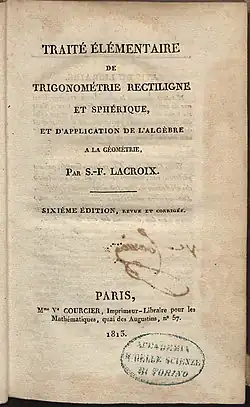- ↑ a b c Ivor Grattan-Guinness (1990) Convolutions in French Mathematics, 1800 — 1840, §2.5.4 Lacroix: scientific educator, pp 113,4, Science Networks: Historical Studies v. 2, Birkhäuser ISBN 3-7643-2240-3