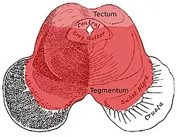 Téctum en su traducción en latín que significa «techo»: «parte interior y superior que cubre o cierra un edificio o habitación». Consiste en 4 cuerpos nodulares, 2 colículos superiores y 2 coliculos inferiores , los 2 superiores controlan los movimientos oculares los 2 inferiores producen reacciones motoras ante señales auditivas