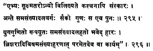 El comentario Yuktidipika–Laghuvivrthi de Tantrasangraha, un tratado escrito por Nilakantha Somayaji, un astrónomo y matemático perteneciente a la escuela de astronomía y matemáticas de Kerala y completado en 1501, presenta el segundo término de corrección en los siguientes versos (Capítulo 2: Versos 271–274): [3][1]