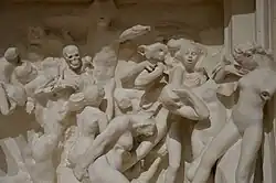 Las figuras independientes, añadidas por Rodin delante de estos relieves ausentes en las fotografías de 1887, rompen con la organización de la que el artista parece haberse olvidado.