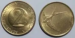 2 Tólar | Cu+Ni+Zn | 24,00 | 5,40 | Estriado | Golondrina - HIRUNDO RUSTICA - 2 | 2 - DVA TOLARJA - REPUBLIKA SLOVENIJA - año de acuñación |