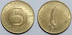 5 Tólar | Cu+Ni+Zn | 26,00 | 6,40 | Estriado | Íbice - CAPRA IBEX - 5 | 5 - PET TOLARJEV - REPUBLIKA SLOVENIJA - año de acuñación |