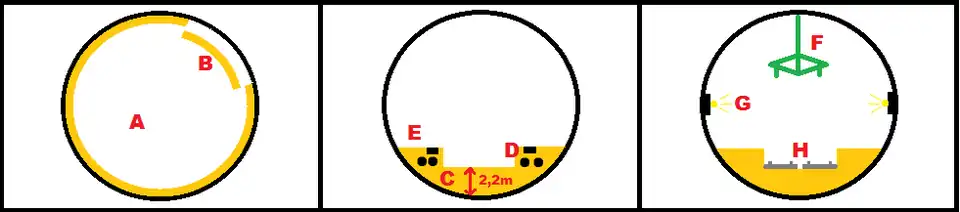 - Fase 2: relleno de la base del túnel con hormigón (C), construcción e instalación de las canalizaciones ferroviarias (D)[Nota 3] y construcción de los pasillos laterales para el movimiento y evacuación de personas (E).
