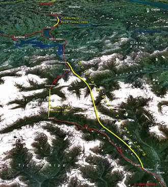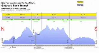 El túnel de base de San Gotardo es un túnel ferroviario bajo los Alpes en Suiza que atraviesa el macizo de San Gotardo en los Alpes Lepontinos. Con una longitud de 57,09 km y un total de 151,84 km de túneles y galerías, es el túnel ferroviario más largo y profundo del mundo. La perforación concluyó el 15 de octubre de 2010[3]​ y fue inaugurado oficialmente el 1 de junio de 2016.[4][2]