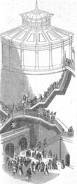 Entre los bloques de edificios [en Wapping] que separan la calle del río, se hace notar un edificio octogonal de mármol. Entramos por una de varias puertas grandes y nos encontramos en una rotonda de quince metros de diámetro, cuyo suelo está revestido con mosaicos de mármol azul y blanco. Los muros están estucados, y a su alrededor se sitúan los puestos de venta de periódicos, folletos, libros, confitería, cerveza, etc. Una especie de caseta de vigilancia se encuentra en el lado de la rotonda junto al río, en la que se localiza un cobrador. Delante de él hay un torniquete de latón, a través del cual se permite pasar al visitante, pagándole un centavo, y, al cruzar una puerta, comienza a descender el pozo, por un tramo de larguísimos escalones de mármol que bajan hasta alcanzar una amplia plataforma, desde la que la siguiente serie de escalones desciende en dirección opuesta. Las paredes del pozo son circulares, rematadas con estuco y adornadas con pinturas y otros objetos curiosos. Te detienes unos instantes en la primera plataforma y escuchas las notas de un enorme órgano que ocupa una parte de ella, resonando una excelente música.Reanudas tu viaje descendente hasta llegar al siguiente piso, o plataforma de mármol, donde encuentras otros objetos de curiosidad para captar tu atención mientras te detienes a descansar. Y así desciendes, desciendes, hasta el fondo del pozo de ochenta pies; mientras tanto, las paredes estaban tachonadas con cuadros, estatuas o figuras en yeso, etc. Llegado al fondo, te encuentras en una rotonda correspondiente a la que entraste desde la calle, una habitación redonda, con piso de mármol, de quince metros de diámetro. Hay nichos cerca de las paredes en los que hay todo tipo de artilugios para que puedas gastar tu dinero, desde nigromantes egipcios y adivinos hasta monos bailarines. La habitación está iluminada con gas y es brillante.