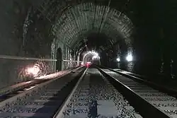 El túnel es de un solo tubo con dos vías (una para cada sentido de circulación). Los trenes tardan aproximadamente 11 minutos en atravesar el túnel.