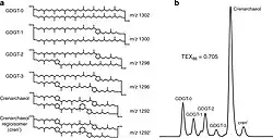 Wuchter et al. (2004) hallaron que el número de anillos ciclopentanos en las membranas lipídicas de Crenarchaeota cambian linealmente con la Tº con el fin de regular la fluidez de las membranas. La composición sedimentaria de tales lípidos –que existen tan atrás como en el Cretáceo Temprano–, que puede ser usado para reconstruir las temperaturas medias experimentadas por el plancton, y por lo tanto de la columna de agua en el pasado.