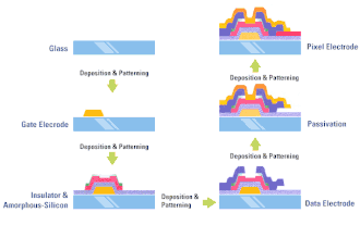 Debido a que los sustratos convencionales no pueden soportar el recocido a altas temperaturas, el proceso de deposición tiene que ser realizado en temperaturas relativamente bajas. Se utiliza la deposición química de vapor y la deposición física de vapor (por lo general pulverización catódica). Además, la primera solución de procesado TFT transparente (TTFTs), sobre la base de óxido de zinc, fue anunciado en 2003 por investigadores de la Oregon State University.[4]