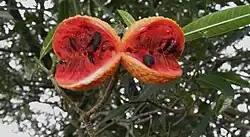 El fruto es carnoso y folicular, de color amarillo a anaranjado-rojizo al madurar, muricados por fuera, y con el ápice obtuso; miden de entre 2 y 3,4 cm por entre 1,3 y 2,2 cm. Las semillas miden entre 6,5 y 7,5 mm, y presentan un arilo de color rojizo o anaranjado.