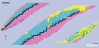 - ↑ La carta de nucleidos de Karlsruhe consiste en una representación gráfica bidimensional en el ordenamiento de Segrè, con el número de neutrón N en la abscisa y el número de protón Z en la ordenada. Cada nucleido está representado en la intersección de su respectivo número de neutrón y protón mediante un pequeño recuadro con el símbolo químico y el número de nucleón A. El Karlsruhe Nuclide Chart se publica principalmente como un gráfico desplegable (tamaño A4) o como un gráfico de pared (tamaño 0,96 m × 1,40 m).[4] [5][5] También hay tamaños más grandes (mapa enrollable, gráfico de auditorio y "alfombra").[6] Desde 2014, se ofrece una versión basada en Internet "Karlsruhe Nuclide Chart Online (KNCO)" con actualizaciones periódicas a través del portal de Internet de ciencia nuclear Nucleonica.[5] Para apoyar la educación nuclear, se ha desarrollado una versión escolar simplificada, la KNClight[7] [6].