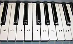 - Las letras mayúsculas (A, C, D, F, G) indican que las notas son sostenidas (las teclas negras). Agregar el signo de nota sostenida # después de la nota también es aceptable (A#, C#, D#, F#, G#) pero usar el método de las letras mayúsculas y minúsculas es recomendable porque ahorra espacio.[1]