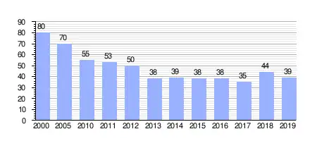 | Gráfica de evolución demográfica de Tabuyuelo de Jamuz entre 2000 y 2019 |