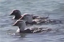 Dos machos y una hembra de pato vapor cabeza blanca (Tachyeres leucocephalus), en Bahía Bustamante, provincia del Chubut, Patagonia argentina. | ||