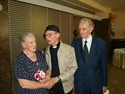 Wanda Półtawska (izq) con su marido Andrzej Półtawski (derecha) y Tadeusz Styczeń (en el centro) en 2008. | ||