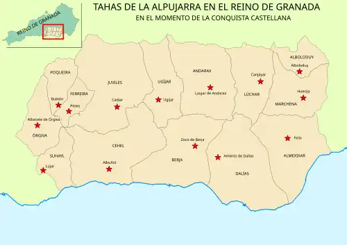 Según los datos recogidos por los historiadores, La Alpujarra estaba dividida en 14 tahas, enumeradas a continuación de occidente a oriente[2] con las alquerías que las integraban a finales del siglo XV:[3]