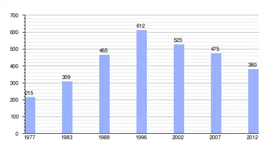 | Gráfica de evolución demográfica de Takapoto entre 1977 y 2012 |