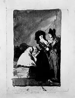 El dibujo preparatorio en aguada de tinta china, conservado en el Museo del Prado, lleva a lápiz la siguiente inscripción: Las viejas se salen de risa porque saben que él no lleva un cuarto. La estampa es muy fiel al dibujo.[4] Según Gassier, el dibujo preparatorio se trata del que estaba pensado como Sueño 19.[5]