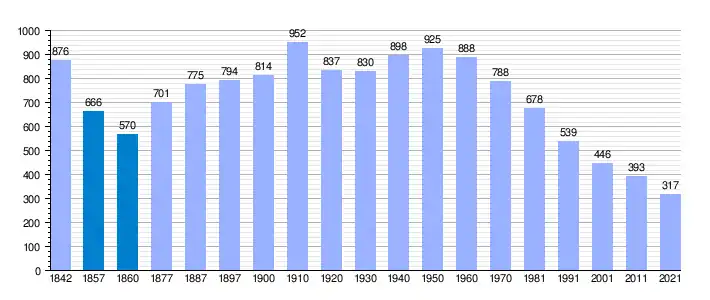 | Gráfica de evolución demográfica de Talaveruela de la Vera[6] entre 1842 y 2021 |