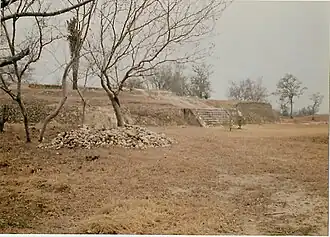 Ocupa una extensión aproximada de 210 hectáreas, sus construcciones se encuentran tanto sobre protuberancias naturales y grandes plataformas que sirven de basamento a varios conjuntos con funciones cívicas, religiosas, y habitacionales. La distribución del centro urbano estaba en función de grandes plataformas multifuncionales elevadas. Las periódicas inundaciones limitaron los lugares donde podían construir, por tal razón las casas de la gente común se encuentran en las laderas altas aledañas a las plataformas y sobre otras lomas vecinas donde se construyeron pequeñas terrazas que albergaban habitaciones y huertos. De la extensión total del sitio solo se ha excavado y acondicionado para el público el 0.6 %. Esto es una plataforma rectangular la cual su fachada principal, está orientada hacia el este, con una altura aproximada de 6 metros, que alberga nueve edificios principales y otras construcciones menores. En conjunto abarca un poco más de 8,000 m². Los edificios forman una plaza abierta hacia el este, que está enmarcada por cinco basamentos mayores y con tres edificios menores al centro. Las construcciones se elaboraron aglomerando y compactando la tierra y revistiéndolas con cantos rodados, los cuales fueron recubiertos con un aplanado de estuco. En algunas terrazas periféricas, se construyeron hornos subterráneos para elaborar cerámica. Podemos afirmar que la elite gobernante ocupó las grandes plataformas.