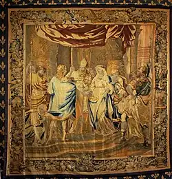 Cuando el ministro de Luis XIV, Jean-Baptiste Colbert, organizó la fábrica real de Gobelinos, se tejió por primera vez en Bruselas una suite Los Hechos de los Apóstoles. Los talleres bruselenses pronto cayeron bajo la influencia del diseño francés procedente de los Gobelinos, apoyados por la realeza, hasta el punto de que la suite de la Historia de Alejandro, una alegoría poco disimulada que pregonaba el ascenso de Luis XIV, se tejió también en Bruselas, entre otros lugares.[31] Bruselas recibió una afluencia de trabajadores altamente capacitados cuando los Gobelinos fueron cerrados temporalmente en 1694 y se ordenó a los tejedores que se dispersaran, bajo las restricciones financieras de las guerras de Luis XIV.[32]