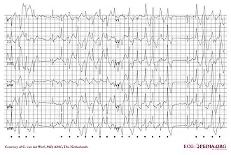 - ↑ a b c d e Liu N, Napolitano C, Priori S (2013). «Chapter 31: Catecholaminergic Polymorphic Ventricular Tachycardia. In: Electrical diseases of the heart. Volume 2, Diagnosis and treatment». Arthur Wilde, Ihor Gussak, Michael J. Ackerman, Win-Kuang Shen, and Charles Antzelevitch (2nd ed.). London: Springer. ISBN 978-1-4471-4978-1. OCLC 846445829.