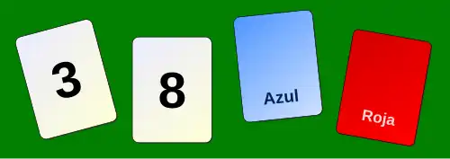 - Te muestran un grupo de cuatro cartas en una mesa. Cada una tiene un número de un lado y un color del otro. Las caras visibles de las cartas muestran 3, 8, azul y roja. ¿A qué dos cartas debería dar vuelta para comprobar la veracidad de la proposición de que si una carta muestra un número par por un lado, entonces la cara opuesta muestra azul?