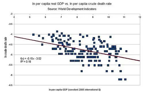 Generalmente en los países menos desarrollados la tasa de mortalidad y natalidad es más alta, mientras que en los más desarrollados la tasa de mortalidad y natalidad es más baja. La tasa de mortalidad está negativamente correlacionada con la esperanza de vida al nacer, de tal manera que cuanta más esperanza de vida tenga un individuo en su nacimiento, menos tasa de mortalidad tiene la población.