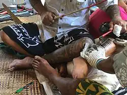 Las herramientas tradicionales de tatuaje consistían en un peine con dientes de hueso o concha de tortuga unidos a un mango de madera. Los dientes estaban empapados en tinta a base de carbón de nogal diluido en aceite o agua. En el pasado, para tatuar, se introducía debajo de la piel el hollín de una madera calcinada mantenida en la cáscara seca de un coco. Para obtener esta tia iri (tintura tahitiana), los granos de coco fueron quemados y diluidos en agua tibia o aceite de coco cuando se iban a usar. El tia iri fue insertado en la piel con un diente o concha de tiburón adherido a la punta de un "TA" (pequeño palo tahitiano), que era golpeado en pequeños golpes con un mazo, causando que la piel fuera cortada y que la tinta penetrara. El maestro tatuador siempre llevaba en la otra mano una pequeña pieza de tejido de tapa.[4] Siempre guardaba sus instrumentos en una caja de bambú cubierta con una tapa. Los asistentes le ayudaban a sostener a la persona tatuada y a tensar la piel. De vez en cuando, los asistentes acompañaban este rito con cantos apropiados. Esta operación era larga y dolorosa. La práctica del tatuaje con herramientas tradicionales fue prohibida en 1986 por el Ministerio de Salud debido a la mala higiene de las herramientas hechas de madera y hueso y por lo tanto mal esterilizadas.