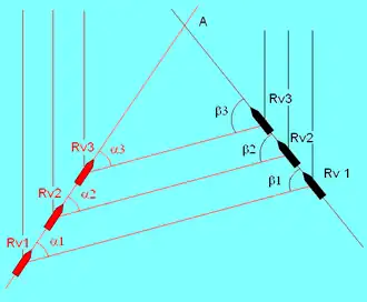 - Ejemplo primero: Un buque se mueve a velocidad y rumbo constantes. El piloto toma la demora de un faro cuando está por el través (m = 90°) y cuando está 45° separado del través (m = 45° o m = 135°). Entonces sabe que la distancia recorrida por el buque entre las dos observaciones es igual a la distancia del buque al faro cuando lo tenía por el través.